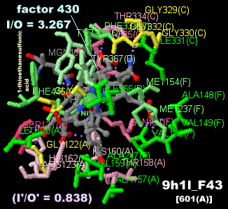 メチル補酵素Mレダクターゼ1mroと同PDBsumデータ1mro_F43(F430と1-チオエタンスルホン酸;大きい球がF430)