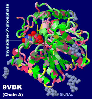 thymidine-3'-phosphateが結合したホスホリパーゼD4(PLD4) 9vbkのChain AとPDBsumデータ
