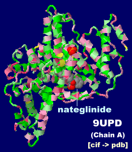 左から ナテグリニド(nateglinide),同分子結合ヒト血清アルブミン9updのChain AとそのPDBsumデータ
