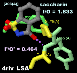 いろいろな分子モデル表示形式例:サッカリン(自作分子データ変換プログラム利用);【1】分子ソフト HyperChem(Hypercube社),【2】インターネットWWW上の分子表示 plug-in“ChemscapeChime”(MDL社),【3】CAMD-I plus(矢野・本間),【4】Winmostarクラウドによる(本間作成分子データ),【5】Jmol,【6】サッカリン結合タンパク質例4rivのPDBsumデータ ※I/O値・I'/O'については有機概念図参照