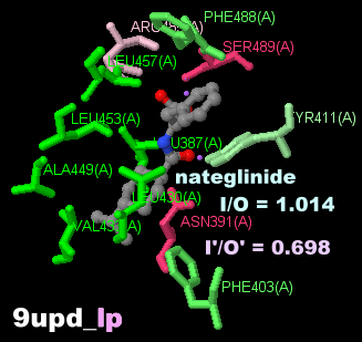 左から ナテグリニド(nateglinide),同分子結合ヒト血清アルブミン9updのChain AとそのPDBsumデータ