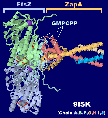 GMPCPPが結合した細菌細胞分裂タンパク質FtsZとZapAの複合体9iskのChain A・B・F・G・H・I・JとPDBsumデータ
