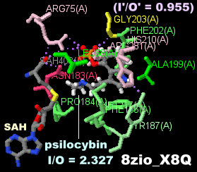 ◆同上 8zio(シロシビンが結合したシロシビンシンターゼPsiM〈メチルトランスフェラーゼPsiM〉) PDBsumデータ 8zio_X8Q$