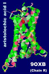 [右]苦味物質アリストロキア酸I(aristolochic acid I)が結合した苦味受容体TAS2R43