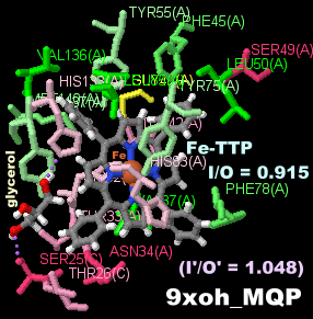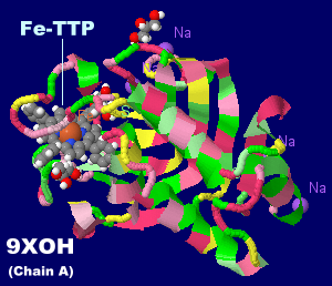 鉄テトラフェニルポルフィリン(Fe-TTP)が結合したヘム獲得タンパク質HasA 9xohのChain AとPDBsumデータ